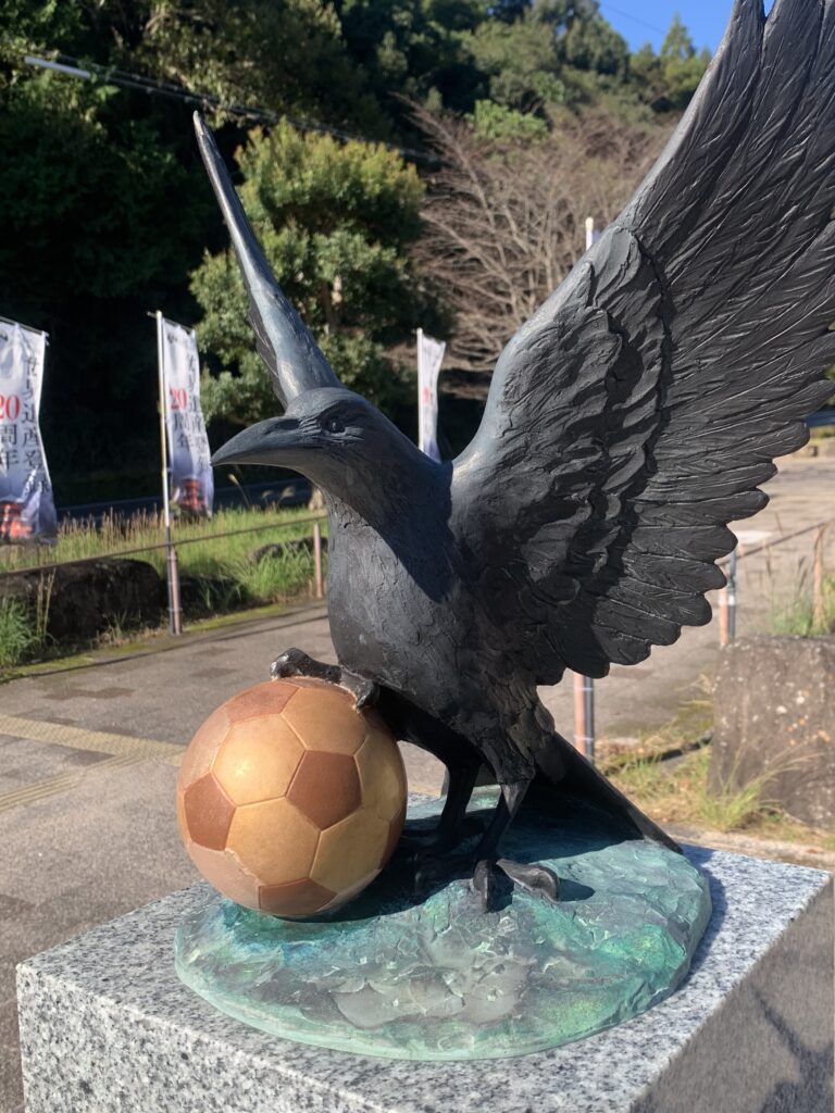 現那智勝浦町出身の中村覚之助さんは、日本にサッカーを広めた人物と言われています。現在の筑波大学の前身にあたる学校である、東京高等師範学校の卒業生でして、那智町浜ノ宮生まれでした。浜ノ宮は、日本書紀や古事記に現れる神武天皇東征の伝説で、大阪から海伝いに南下して上陸した熊野の地になります。そこから大和の飛鳥あたり(奈良・橿原)をめざした際に神武天皇の道案内をしたのが、三本足のカラス、八咫烏(ヤタガラス)だった、という伝説があります。